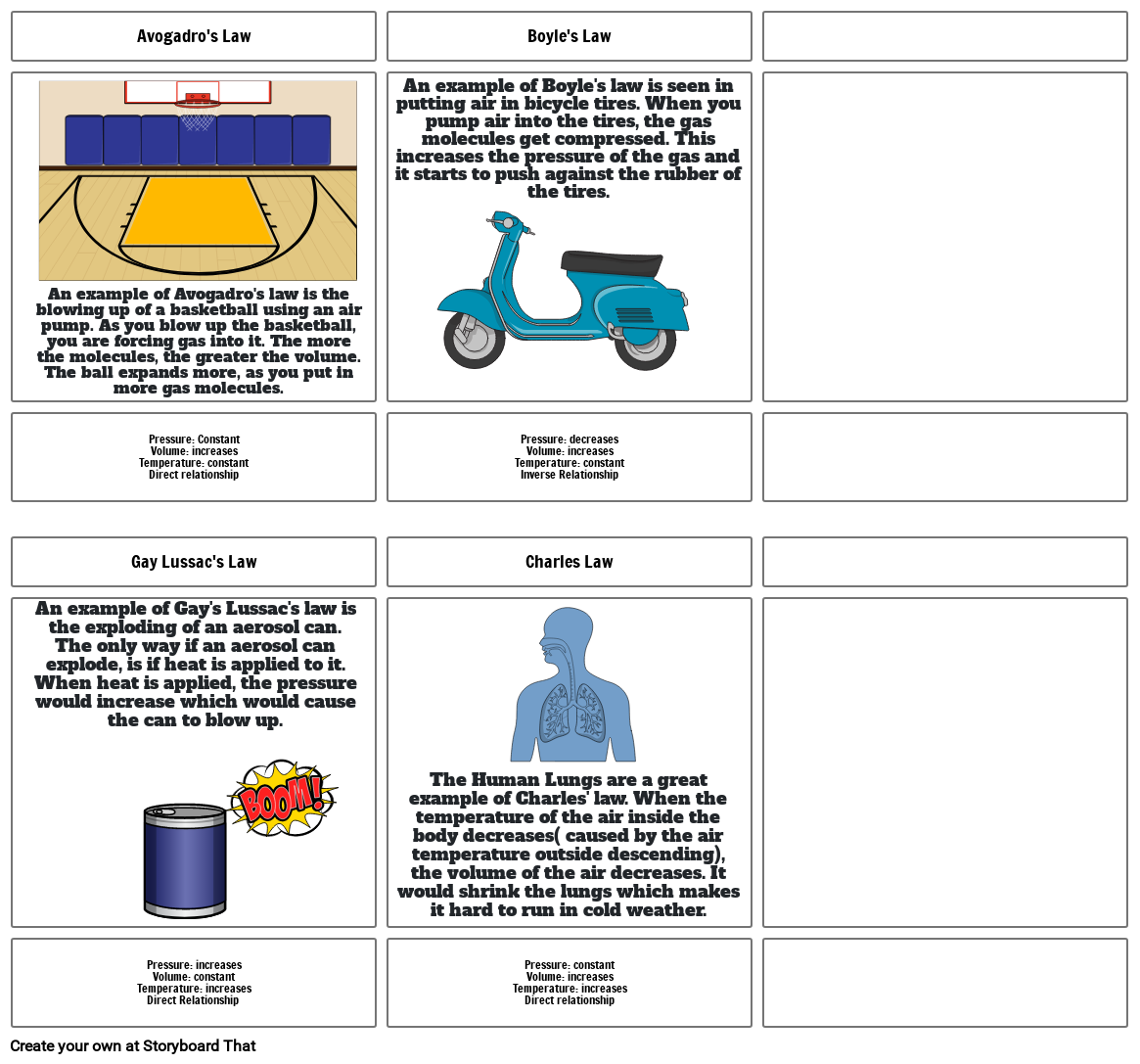 The Human Lungs are a great example of Charles' law. When the temperature of the air inside the body decreases( caused by the air temperature outside descending), the volume of the air decreases. It would shrink the lungs which makes it hard to run in cold weather.