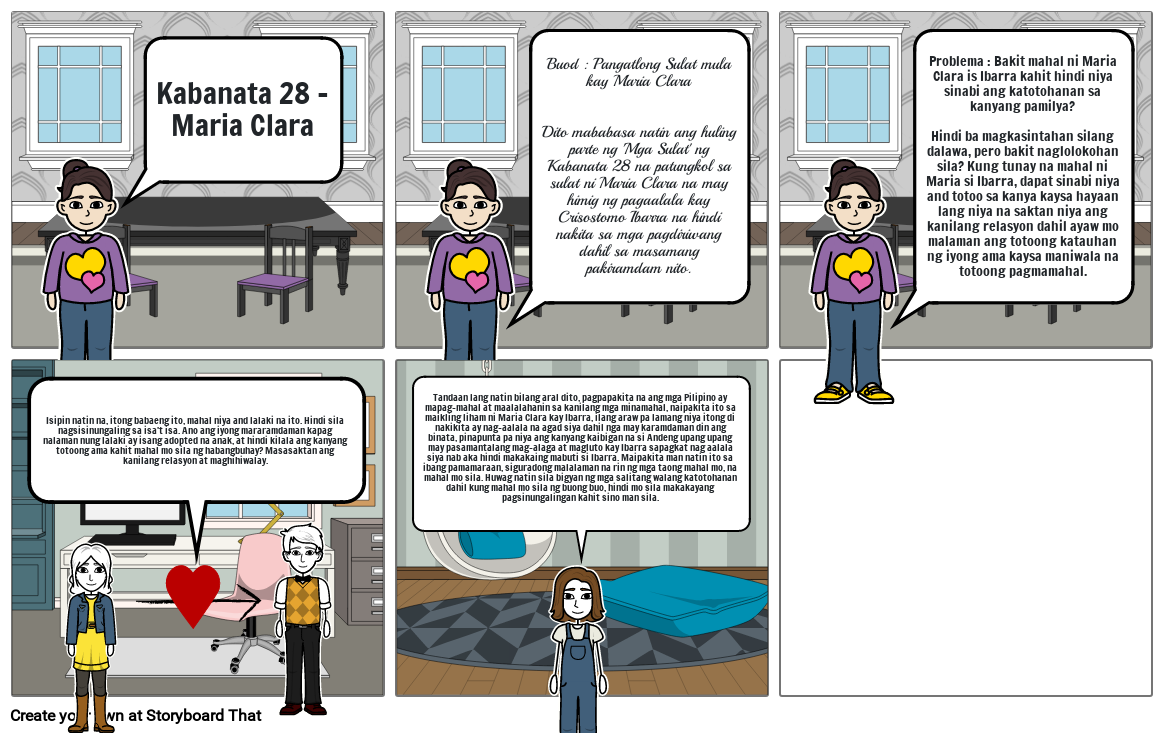 Problema : Bakit mahal ni Maria Clara is Ibarra kahit hindi niya sinabi ang katotohanan sa kanyang pamilya?Hindi ba magkasintahan silang dalawa, pero bakit naglolokohan sila? Kung tunay na mahal ni Maria si Ibarra, dapat sinabi niya and totoo sa kanya kaysa hayaan lang niya na saktan niya ang kanilang relasyon dahil ayaw mo malaman ang totoong katauhan ng iyong ama kaysa maniwala na totoong pagmamahal.