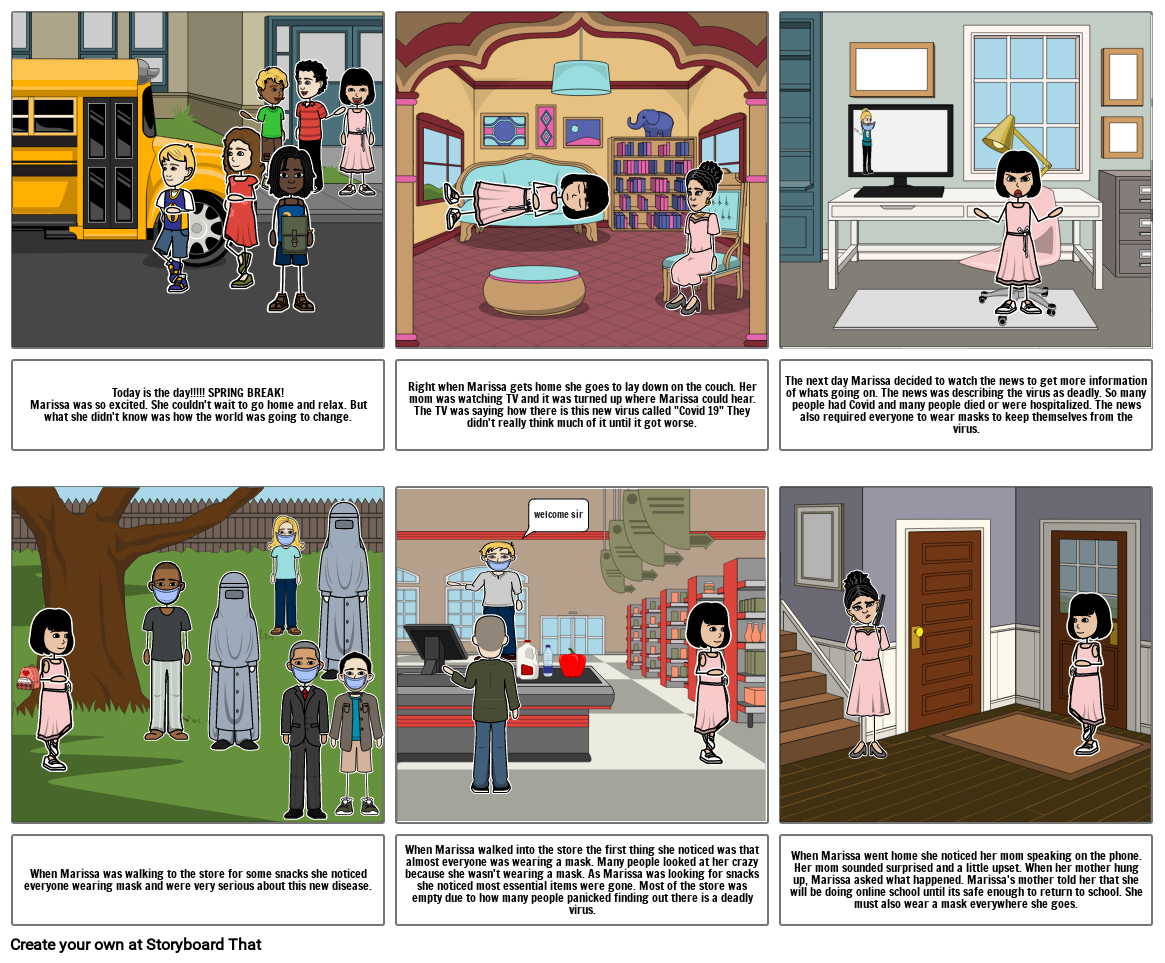 When Marissa went home she noticed her mom speaking on the phone. Her mom sounded surprised and a little upset. When her mother hung up, Marissa asked what happened. Marissa's mother told her that she will be doing online school until its safe enough to return to school. She must also wear a mask everywhere she goes.