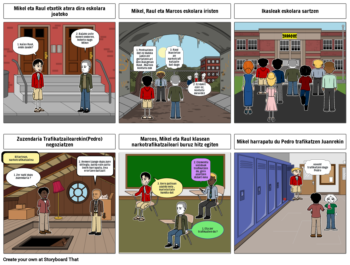 Marcos, Mikel eta Raul klasean narkotrafikatzaileari buruz hitz egiten
