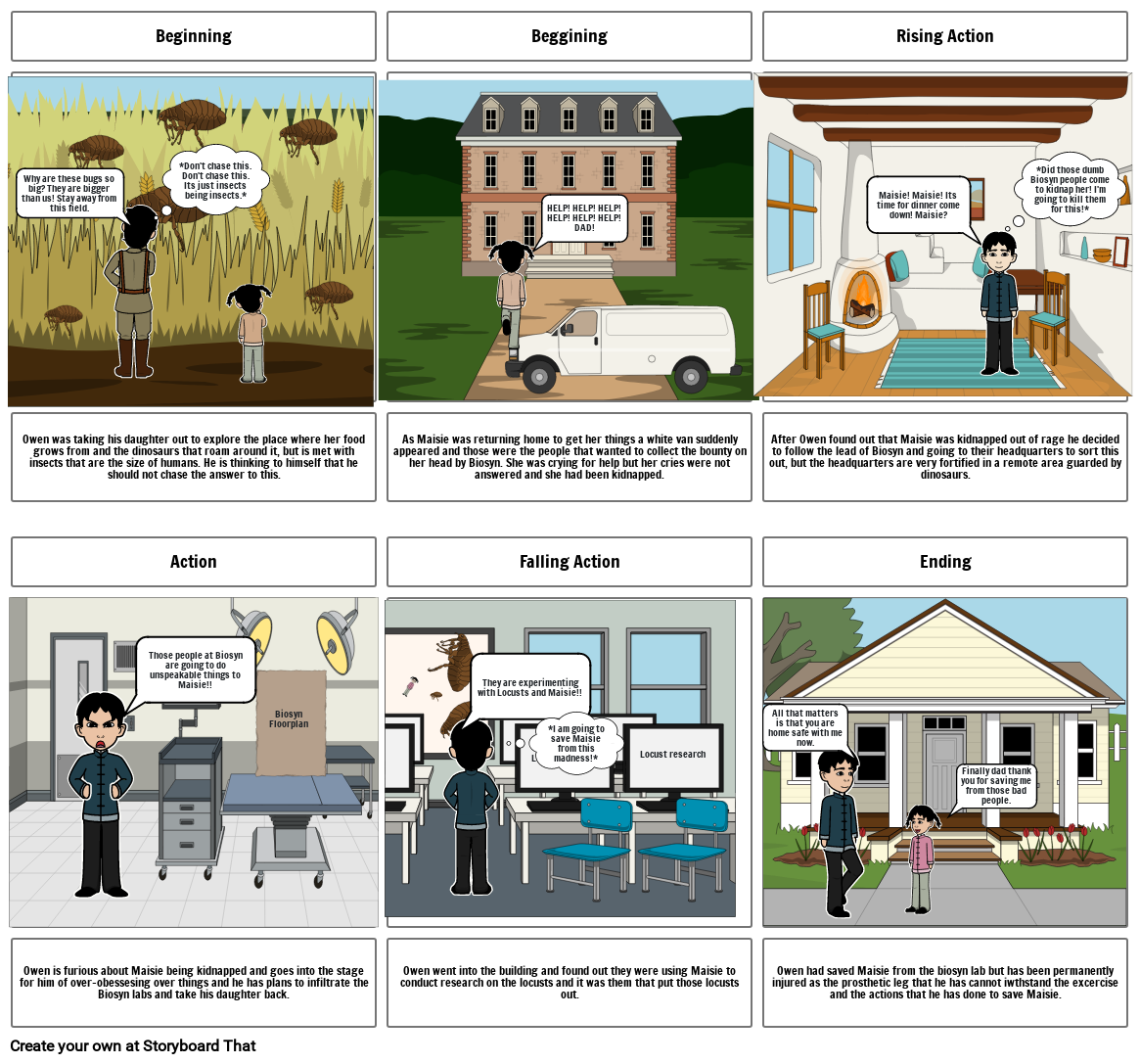Owen was taking his daughter out to explore the place where her food grows from and the dinosaurs that roam around it, but is met with insects that are the size of humans. He is thinking to himself that he should not chase the answer to this.