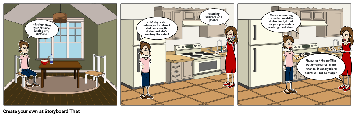 Mom your wasting the water! wash the dishes first, do not use your phone while washing the dishes!