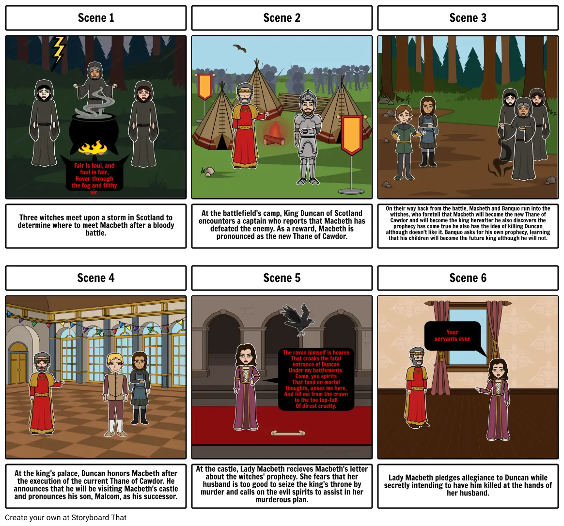 On their way back from the battle, Macbeth and Banquo run into the witches, who foretell that Macbeth will become the new Thane of Cawdor and will become the king hereafter he also discovers the prophecy has come true he also has the idea of killing Duncan although doesn't like it. Banquo asks for his own prophecy, learning that his children will become the future king although he will not.