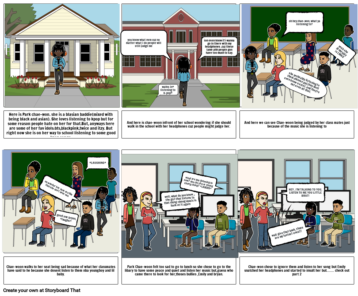 Here is Park chae-won. she is a blasian baddie(mixed with being black and asian). She loves listening to kpop but for some reason people hate on her for that.But, anyways here are some of her fav idols:bts,blackpink,twice and itzy. But right now she is on her way to school listening to some good kpop songs.