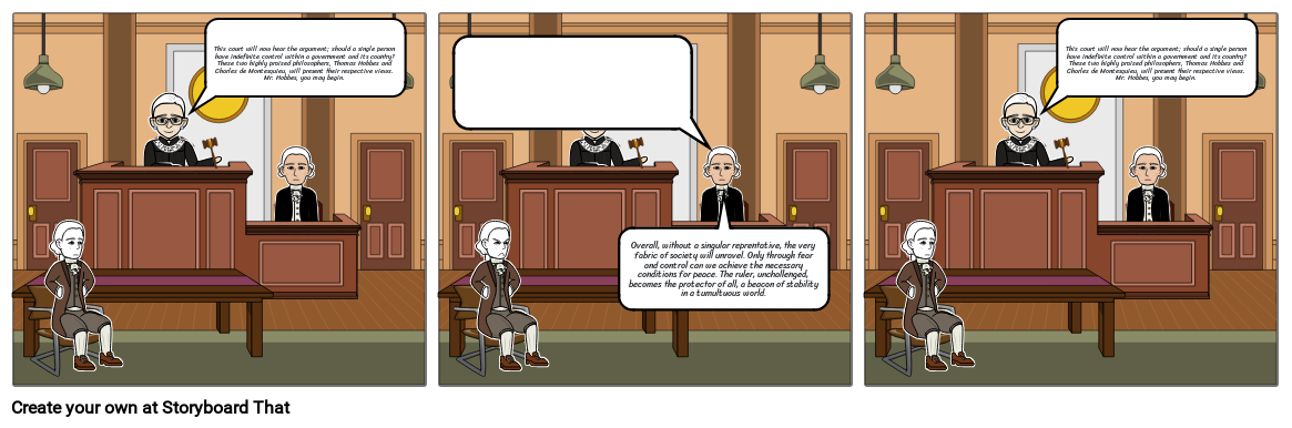 This court will now hear the argument; should a single person have indefinite control within a government and its country? These two highly praised philosophers, Thomas Hobbes and Charles de Montesquieu, will present their respective views. Mr. Hobbes, you may begin.