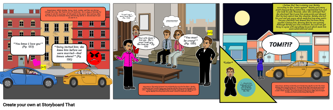 Importance: This rivalry between Tom and Gatsby has reached its climax. Gatsby confidently told Tom that Daisy never loved him and that they were in love with each other. Tom felt angry but still believed that he had the upper hand. He felt Daisy and Myrtle slipping from his grasp and he wasn't about to lose both of them.