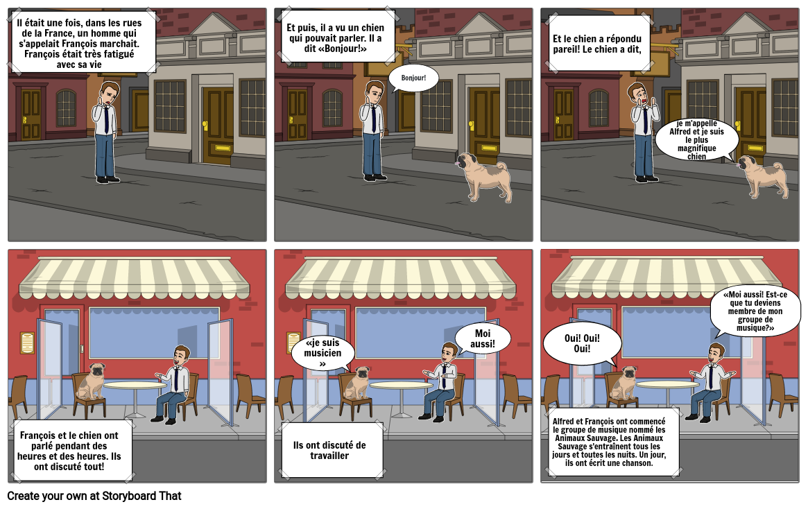Alfred et François ont commencé le groupe de musique nommé les Animaux Sauvage. Les Animaux Sauvage s'entraînent tous les jours et toutes les nuits. Un jour, ils ont écrit une chanson.