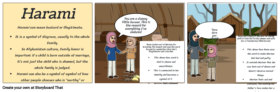 Nana lashes out at Mariam for breaking the teapot and uses the word harami to remind her that she’s illegitimate and a burden.This shows how word is tied to shame and unworthiness.This is connected to her identity and becomes a symbol of it.Mariam feels ashamed, like she’s already done something wrong just by existing.