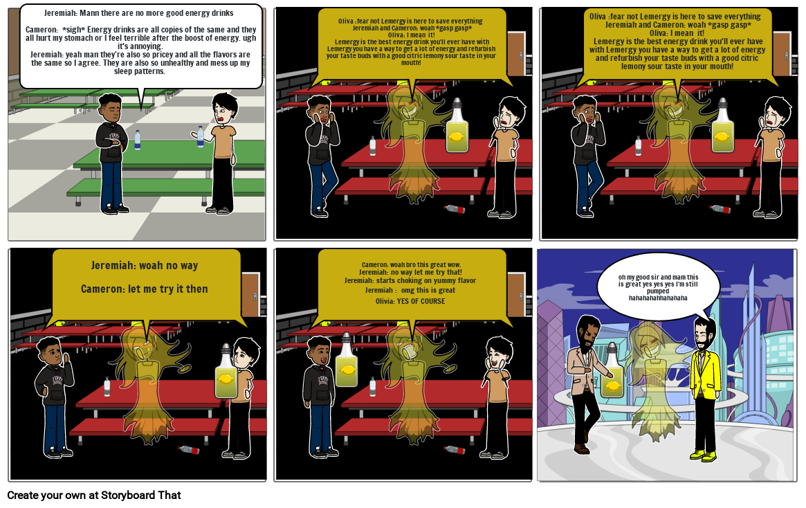 Oliva :fear not Lemergy is here to save everything    Jeremiah and Cameron: woah *gasp gasp* Oliva: I mean  it! Lemergy is the best energy drink you'll ever have with Lemergy you have a way to get a lot of energy and refurbish your taste buds with a good citric lemony sour taste in your mouth!