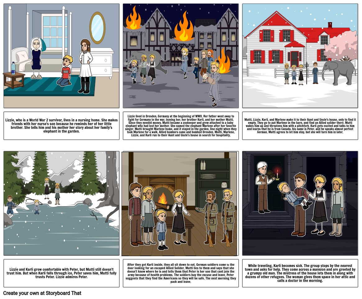 Lizzie lived in Dresden, Germany at the beginning of WWII. Her father went away to fight for Germany in the war, leaving her, her brother Karli, and her mother Mutti. Since they needed money, Mutti became a zookeeper and grew attached to a baby elephant who had lost her mother. She named the elephant Marlene after her favorite singer. Mutti brought Marlene home, and it stayed in the garden. One night when they took Marlene for a walk, Allied bombers came and bombed Dresden. Mutti, Marlene, Lizzie, and Karli run to their Aunt and Uncle’s house in search for hospitality.