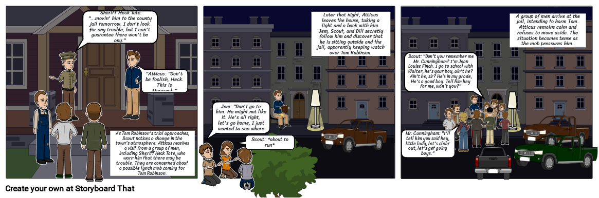 A group of men arrive at the jail, intending to harm Tom. Atticus remains calm and refuses to move aside. The situation becomes tense as the mob pressures him.