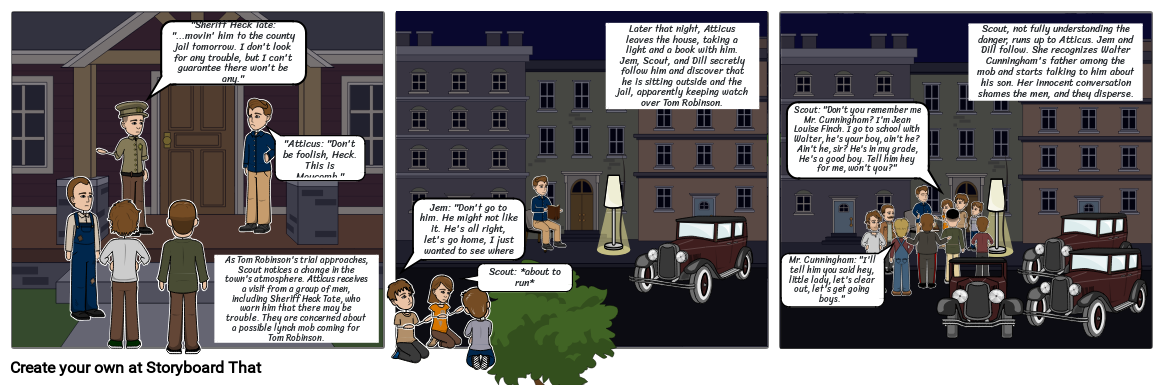 As Tom Robinson's trial approaches, Scout notices a change in the town's atmosphere. Atticus receives a visit from a group of men, including Sheriff Heck Tate, who warn him that there may be trouble. They are concerned about a possible lynch mob coming for Tom Robinson.