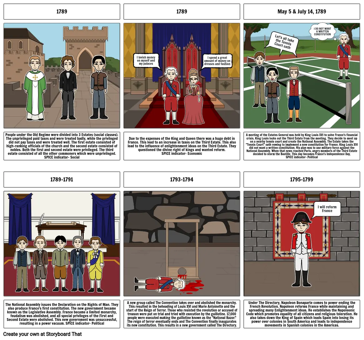 A meeting of the Estates General was held by King Louis XVI to solve France's financial crisis. King Louis locks out the Third Estate from the meeting. They decide to meet up on a nearby tennis court and create the National Assembly. The Estate takes the "Tennis Court" oath vowing to implement a new constitution for France. King Louis XVI did not want a written constitution. His plan was to use military force against the National Assembly. When that news reached Paris, angry members of the Third Estate decided to storm the Bastille. This day becomes France's Independence Day. SPICE indicator- Political
