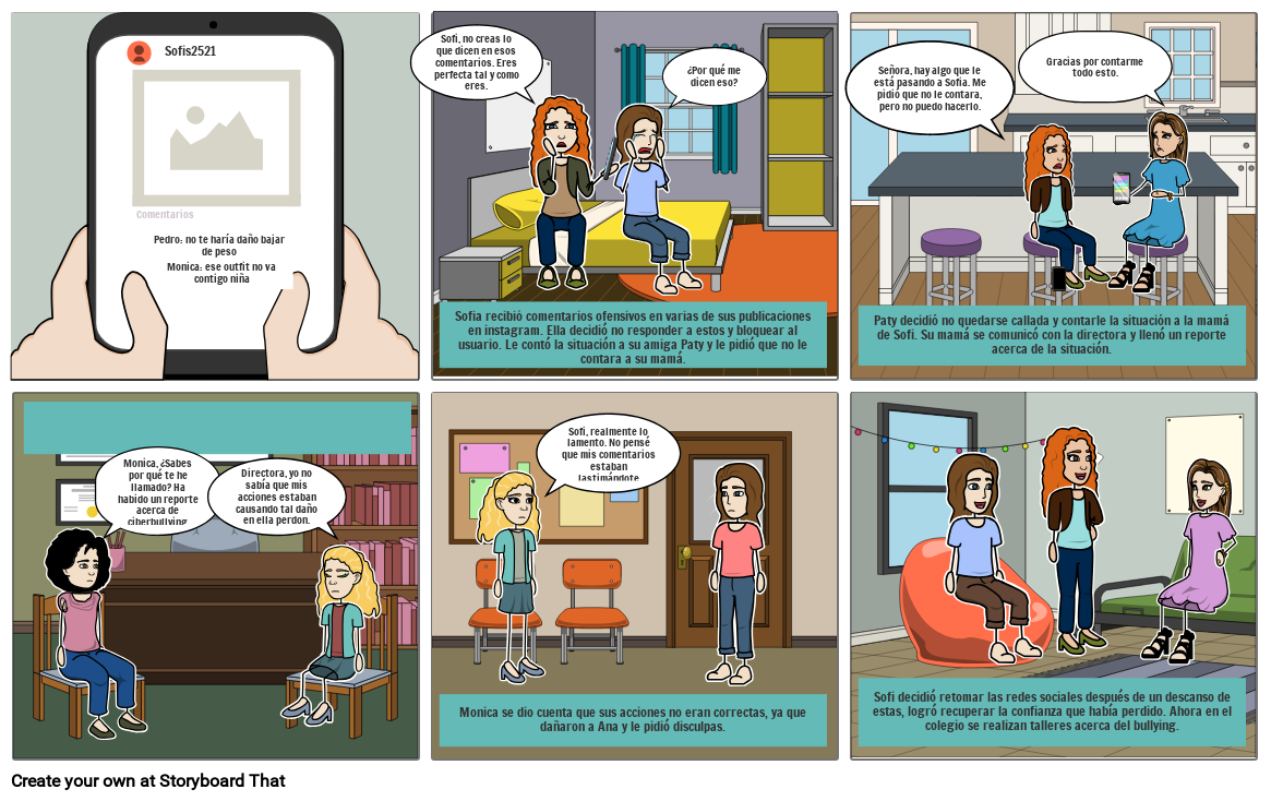 Sofia recibió comentarios ofensivos en varias de sus publicaciones en instagram. Ella decidió no responder a estos y bloquear al usuario. Le contó la situación a su amiga Paty y le pidió que no le contara a su mamá.
