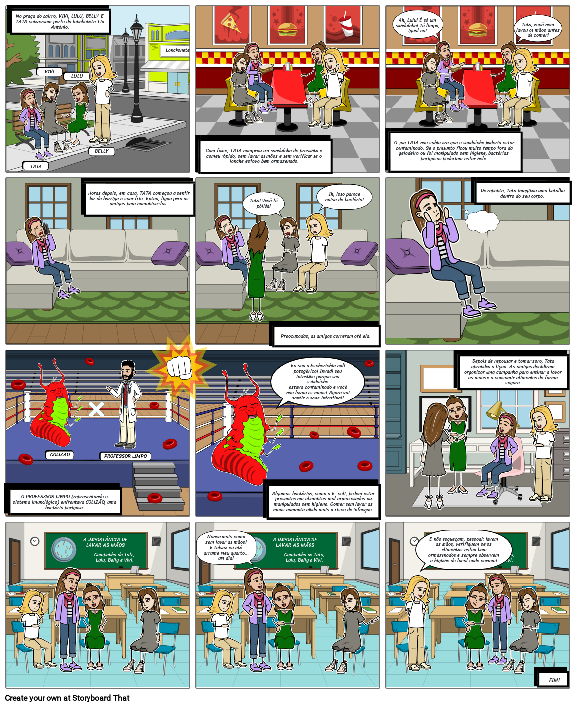 Depois de repousar e tomar soro, Tata aprendeu a lição. As amigas decidiram organizar uma campanha para ensinar a lavar as mãos e a consumir alimentos de forma segura.