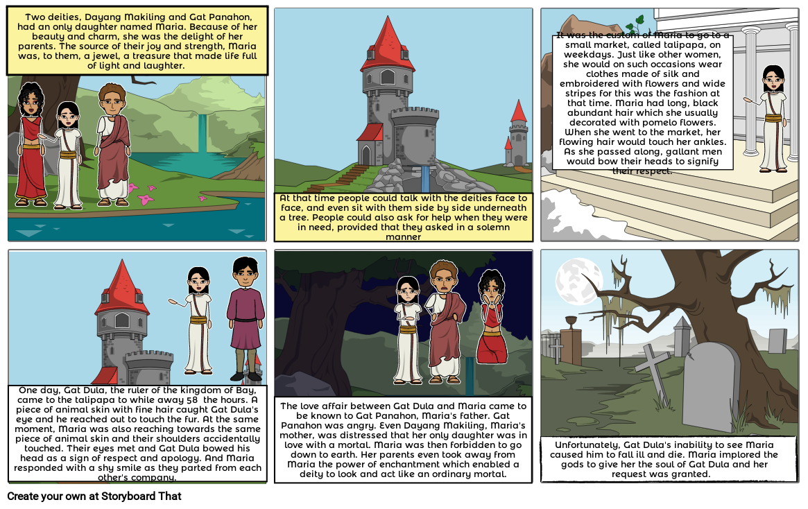 Two deities, Dayang Makiling and Gat Panahon, had an only daughter named Maria. Because of her beauty and charm, she was the delight of her parents. The source of their joy and strength, Maria was, to them, a jewel, a treasure that made life full of light and laughter.