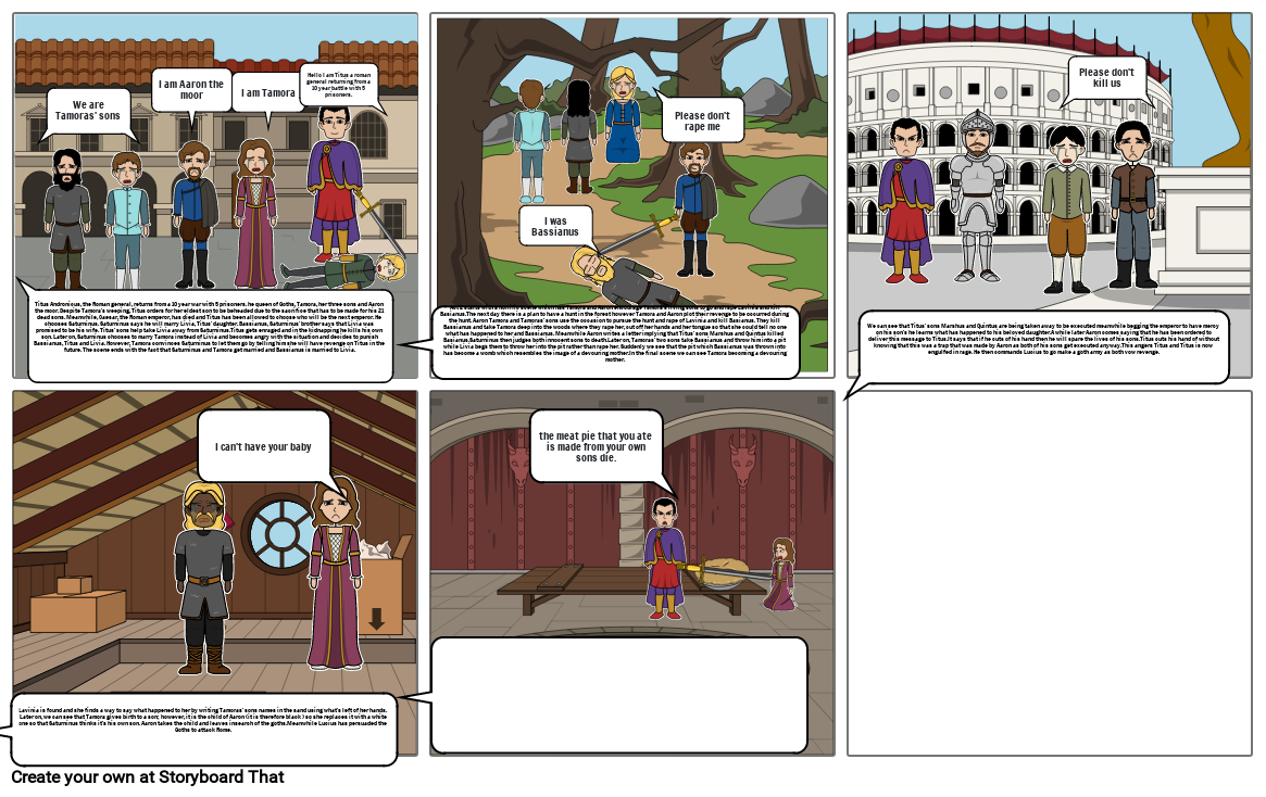 We can see that Aaron has found the Goths however they have been captured and are being imprisoned by them. Lucius demands the execution of both Aaron and his child however Aaron says that if they spare his child then he will tell them about other crimes he commited. Aaron then admits about the death of Bassianus and the rape of Lavinia.Lucius is enraged and he gags and chokes Aaron but he doesn’t kill him. Meanwhile Tamora and her sons try to trick Titus into thinking that they are spirits who will help him get revenge. However Titus recognizes them through the masks and tricks Tamora into leaving her two sons with him.Titus then kills her two sons and mixes their dead corpses into a meat pie. Saturninus Lucius and Tamora all arrive at Titus’ house for a meeting. As they are talking Titus tells them about a man who killed his own daughter after she was raped. Saturninus tells Titus that it was the right decision which enrages Titus resulting in him killing his own daughter Lavinia. The meeting continues and when Titus realizes that Tamora started eating the meat pie he tells her that it is made out of her own sons’. After he has let these words leave his mouth he also kills Tamora. Infuriated, Saturninus kills Titus and Lucius kills Saturninus. Lucius is the new emperor of Rome as the others have perished.