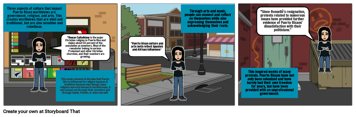 Three aspects of culture that impact Puerto Rican worldviews are government, religion, and arts. This creates worldviews that are vivid and traditional, but are also sensitive and rebellious.