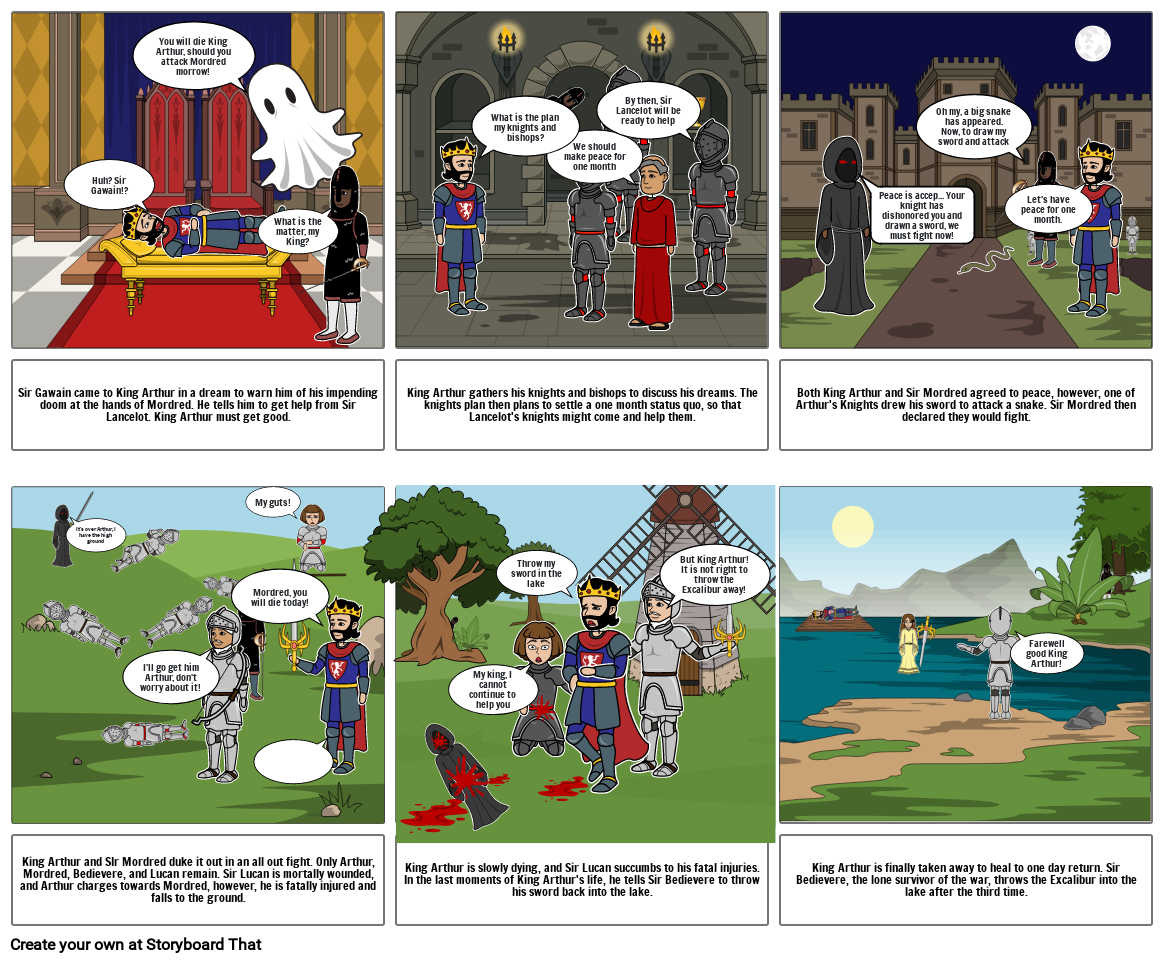 King Arthur and SIr Mordred duke it out in an all out fight. Only Arthur, Mordred, Bedievere, and Lucan remain. Sir Lucan is mortally wounded, and Arthur charges towards Mordred, however, he is fatally injured and falls to the ground.