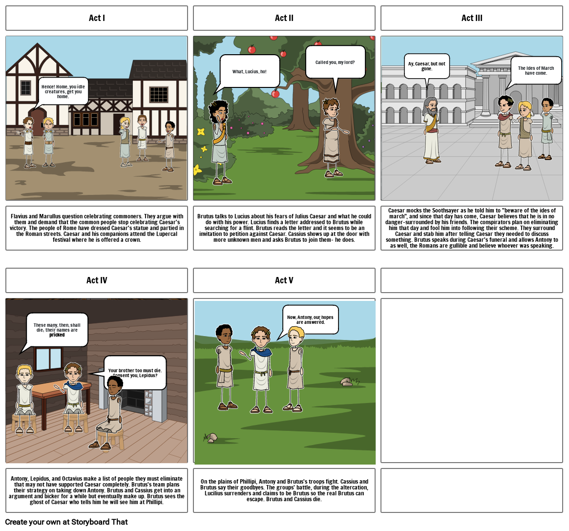 On the plains of Phillipi, Antony and Brutus's troops fight. Cassius and Brutus say their goodbyes. The groups' battle, during the altercation, Lucilius surrenders and claims to be Brutus so the real Brutus can escape. Brutus and Cassius die.