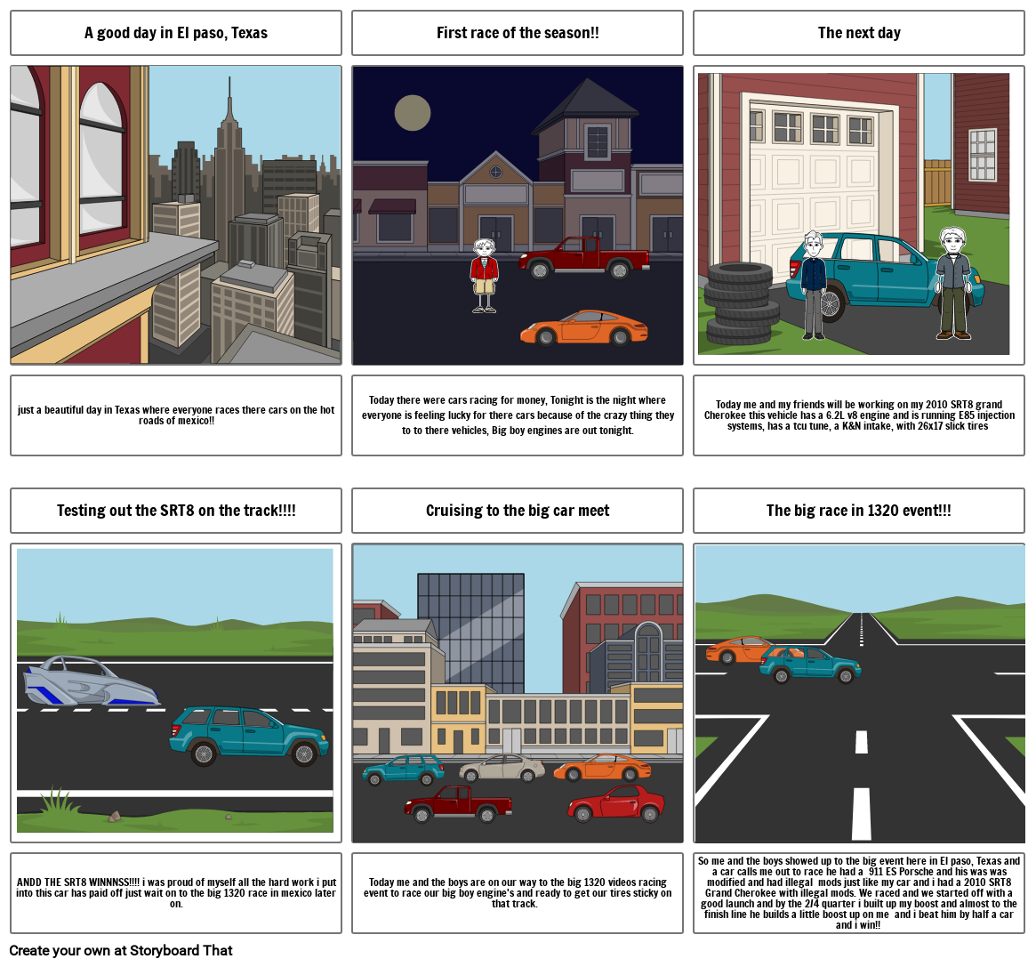 So me and the boys showed up to the big event here in El paso, Texas and a car calls me out to race he had a  911 ES Porsche and his was was modified and had illegal  mods just like my car and i had a 2010 SRT8 Grand Cherokee with illegal mods. We raced and we started off with a good launch and by the 2/4 quarter i built up my boost and almost to the finish line he builds a little boost up on me  and i beat him by half a car and i win!!