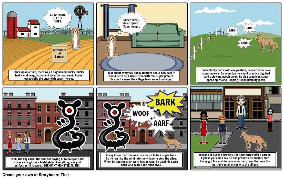 Bucky knew that this was his chance to be a super hero. So he ran like the wind into the village to stop the alien. When he and the alien were face to face, he used his super bark, and scared the alien away.