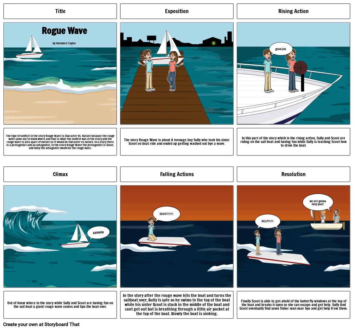 The story Rouge Wave is about A teenage boy Sully who took his sister Scoot on boat ride and ended up getting washed out bye a wave.