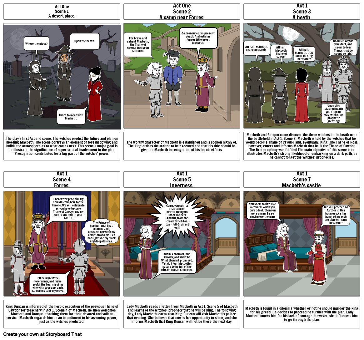 Macbeth and Banquo come discover the three witches in the heath near the battlefield in Act 1, Scene 3. Macbeth is told by the witches that he would become Thane of Cawdor and, eventually, King. The Thane of Ross, however, enters and informs Macbeth that he is the Thane of Cawdor. The first prophecy was fulfilled.The main objective of this scene is to illustrates Macbeth's strong likelihood of embarking on a dark path, as he cannot forget the Witches' prophecies.