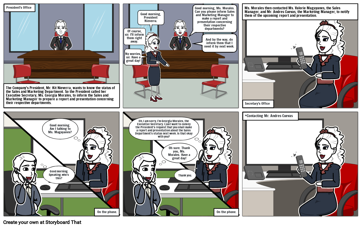 Ms. Morales then contacted Ms. Valorie Magayanes, the Sales Manager, and Mr. Andres Cuevas, the Marketing Manager, to notify them of the upcoming report and presentation.