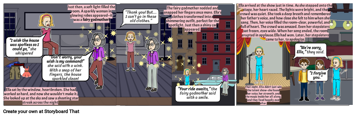 Ella arrived at the show just in time. As she stepped onto the stage, her heart raced. The lights were bright, and the crowd was quiet. She took a deep breath and remembered her father’s voice, and how close she felt to him when she sang. Then, her voice filled the room—clear, powerful, and full of heart. The crowd was amazed. Even her stepsisters sat frozen, eyes wide. When her song ended, the room erupted in applause.Ella had won. Later, her stepsisters came to her, to apologize.