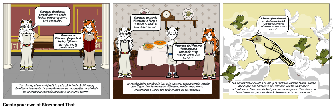 "La verdad había salido a la luz, y la justicia, aunque tardía, estaba por llegar. Las hermanas de Filomena, unidas en su dolor, enfrentaron a Tereo con todo el peso de su venganza. "Los dioses la transformaron, pero su historia permanecería para siempre."