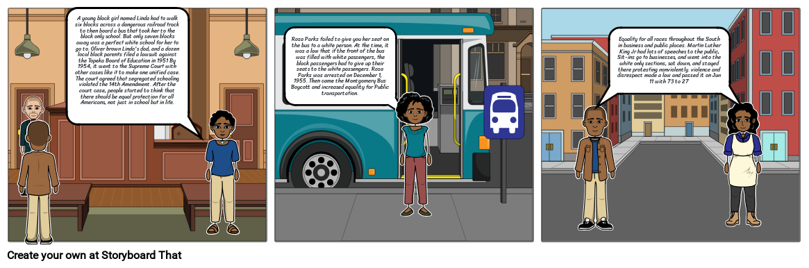 A young black girl named Linda had to walk six blocks across a dangerous railroad track to then board a bus that took her to the black only school. But only seven blocks away was a perfect white school for her to go to. Oliver brown Linda's dad, and a dozen local black parents filed a lawsuit against the Topeka Board of Education in 1951 By 1954, it went to the Supreme Court with other cases like it to make one unified case. The court agreed that segregated schooling violated the 14th Amendment. After the court case, people started to think that there should be equal protection for all Americans, not just in school but in life.