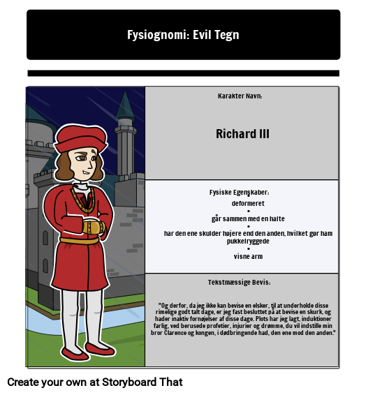 "Og derfor, da jeg ikke kan bevise en elsker, til at underholde disse rimelige godt talt dage, er jeg fast besluttet på at bevise en skurk, og hader inaktiv fornøjelser af disse dage. Plots har jeg lagt, induktioner farlig, ved berusede profetier, injurier og drømme, du vil indstille min bror Clarence og kongen, i dødbringende had, den ene mod den anden."