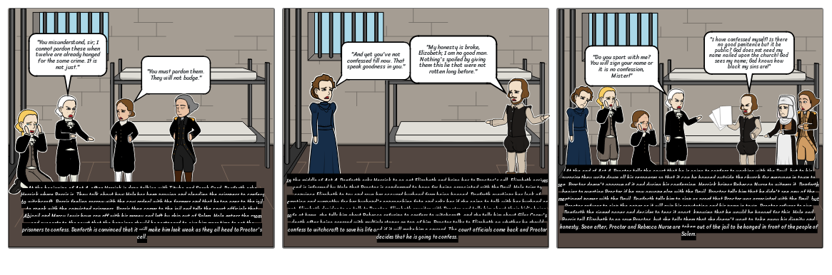 At the end of Act 4, Proctor tells the court that he is going to confess to working with the Devil, but to his surprise they write down all his responses so that it can be hanged outside the church for everyone in town to see. Proctor doesn't approve of it and during his confession, Herrick brings Rebecca Nurse to witness it. Danforth begins to question Proctor if he saw anyone else with the Devil. Proctor tells him that he didn't see any of the mentioned names with the Devil. Danforth tells him to sign as proof that Proctor was associated with the Devil, but Proctor refuses to sign the paper as it will ruin his reputation and his name in town. Proctor refuses to give Danforth the signed paper and decides to tear it apart, knowing that he would be hanged for this. Hale and Parris tell Elizabeth to go save Proctor, but she tells them that she doesn't want to take away his dignity and honesty. Soon after, Proctor and Rebecca Nurse are taken out of the jail to be hanged in front of the people of Salem.