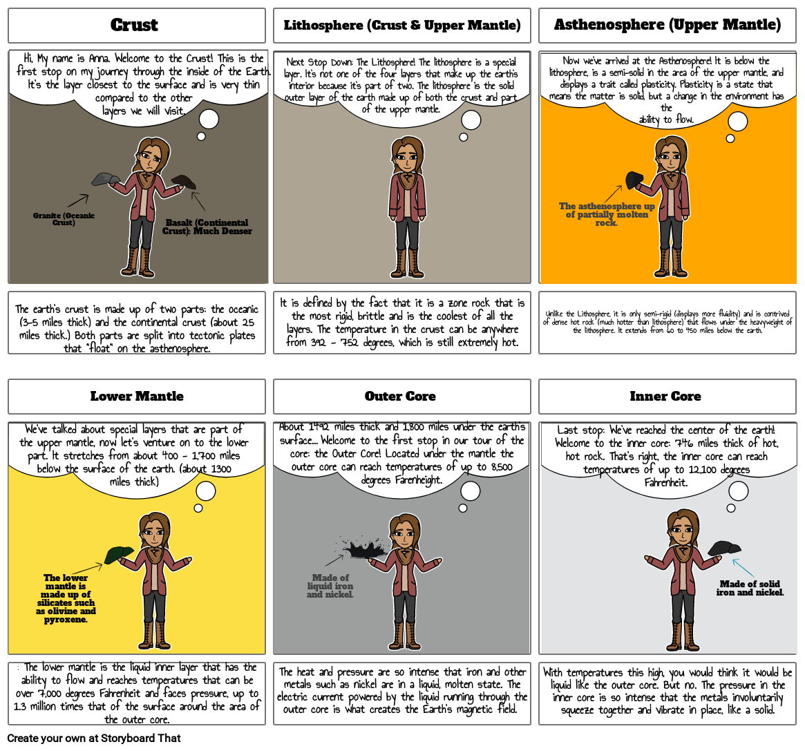 Hi, My name is Anna. Welcome to the Crust! This is the first stop on my journey through the inside of the Earth. It's the layer closest to the surface and is very thin compared to the other layers we will visit.
