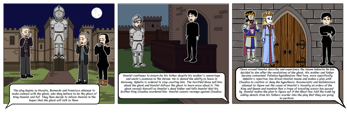 The play begins as Horatio, Barnardo and Francisco attempt to make contact with the ghost, who they believe to be the ghost of King Hamlet and fail. They then decide to inform Hamlet in the hopes that the ghost will talk to them.