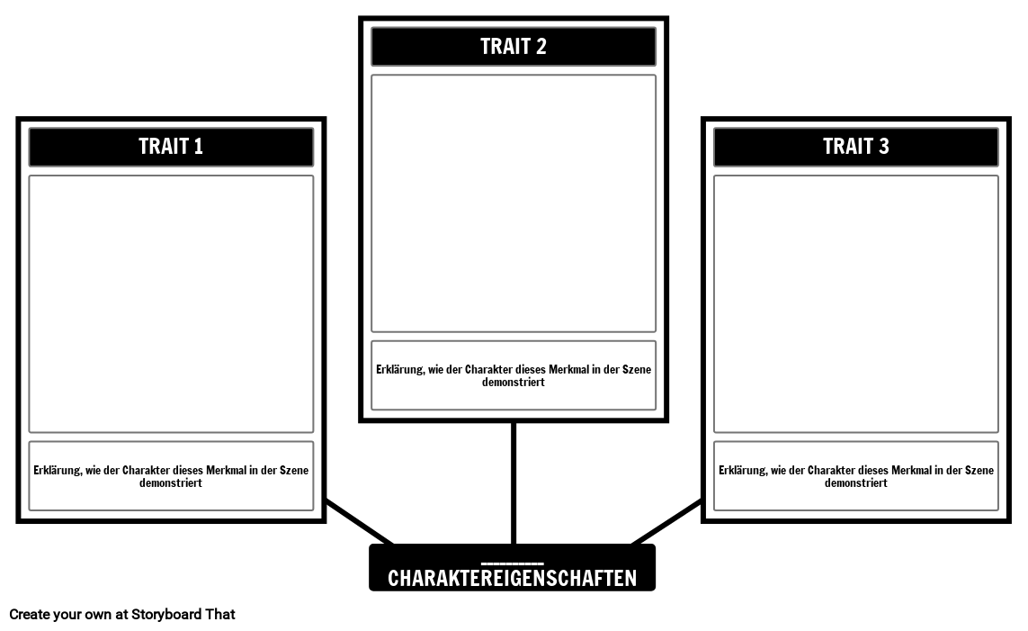 Zeichen-Eigenschafts-Schablone in einer Spinnenkarte. Identifizieren Sie drei Charaktereigenschaften und stellen Sie sie in einem Storyboard dar.