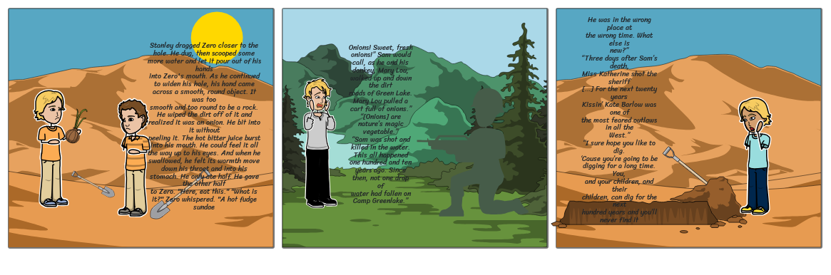 “Stanley dragged Zero closer to the hole. He dug, then scooped some more water and let it pour out of his handsinto Zero's mouth. As he continued to widen his hole, his hand came across a smooth, round object. It was toosmooth and too round to be a rock. He wiped the dirt off of it and realized it was an onion. He bit into it withoutpeeling it. The hot bitter juice burst into his mouth. He could feel it all the way up to his eyes. And when heswallowed, he felt its warmth move down his throat and into his stomach. He only ate half. He gave the other halfto Zero. "Here, eat this." "What is it?" Zero whispered. "A hot fudge sundae."