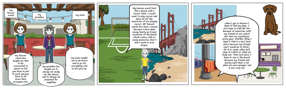 My heaven would look like a beach with a soccer field. I would want to play soccer and have all off the memories of me playing soccer. MY heaven would also have a beach because I have done many family an friend vacations at the beach which comes with so many memories that ii don't want to ever forget.