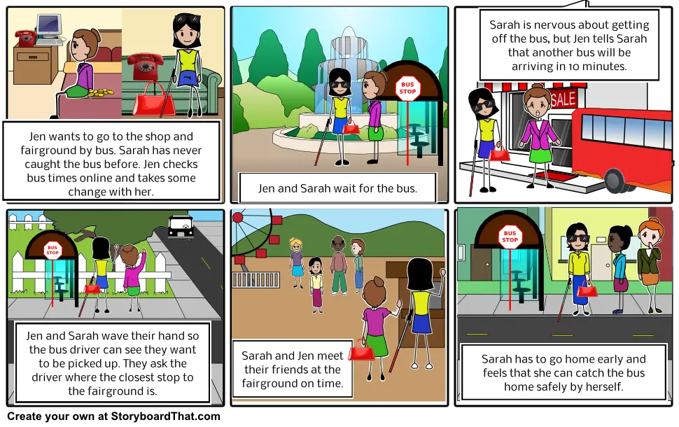 Jen wants to go to the shop and fairground by bus. Sarah has never caught the bus before. Jen checks bus times online and takes some change with her.