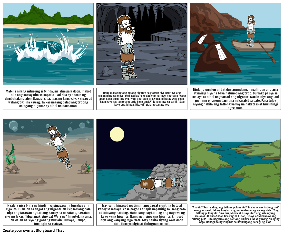 “Ano ito? Saan galing ang tatlong pulong ito? Sila kaya ang tatlong ito?” Tanong sa sarili, lalong lungkot ang naramdaman ng amang ulila. “Ang tatlong pulong ito! Sina Lus, Minda at Bisaya ito!” ang sabi niyang malakas. At buhat noon tinawag na Luson, Bisaya at Mindanaw ang tatlong pulo. Dito nagmula ang bansang Pilipinas. Nasa gawing timog ng Asya. Bahagi ito ng Pilipinas sa katimugang bahagi ng Asya.