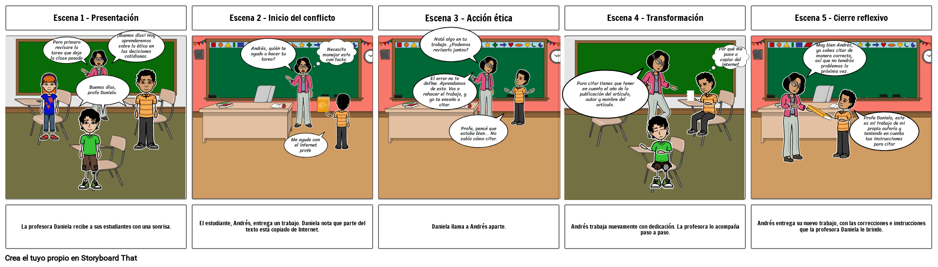 El estudiante, Andrés, entrega un trabajo. Daniela nota que parte del texto está copiado de Internet.