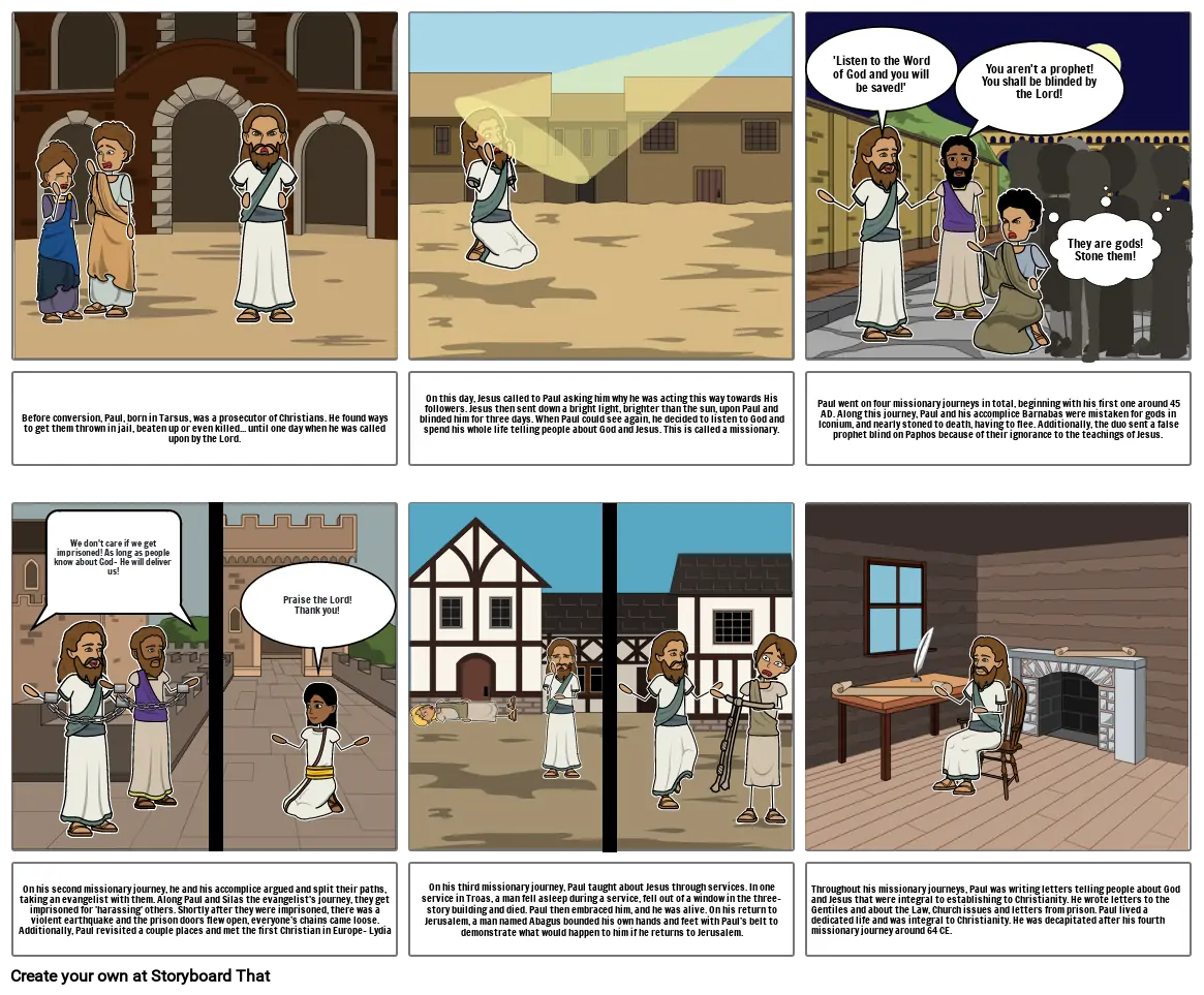 Paul went on four missionary journeys in total, beginning with his first one around 45 AD. Along this journey, Paul and his accomplice Barnabas were mistaken for gods in Iconium, and nearly stoned to death, having to flee. Additionally, the duo sent a false prophet blind on Paphos because of their ignorance to the teachings of Jesus.