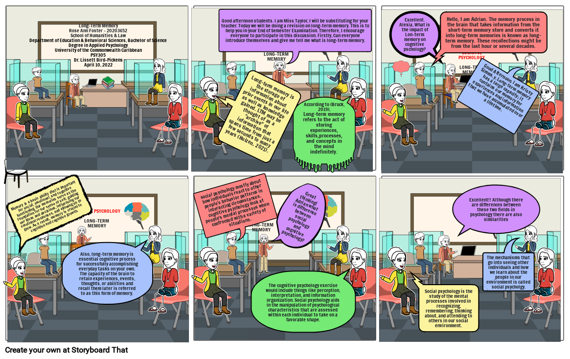 Good afternoon students. I am Miss Taylor, I will be substituting for your teacher. Today we will be doing a revision on long-term memory. This is to help you in your End of Semester Examination. Therefore, I encourage everyone to participate in this discussion. Firstly, Can everyone introduce themselves and give me tell me what is long-term memory.