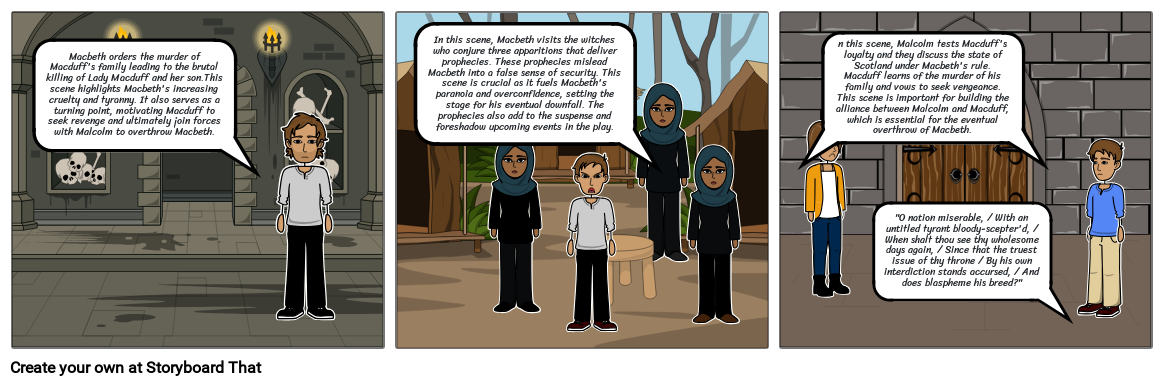 Macbeth orders the murder of Macduff's family leading to the brutal killing of Lady Macduff and her son.This scene highlights Macbeth's increasing cruelty and tyranny. It also serves as a turning point, motivating Macduff to seek revenge and ultimately join forces with Malcolm to overthrow Macbeth.