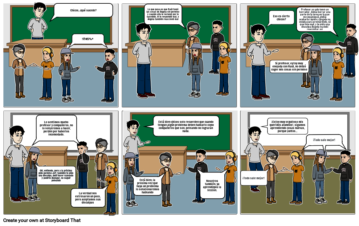 Profesor yo solo tomé un borrador, debía borrar una parte de la tarea en la que me equivoqué, debía acabarla rápido y Ángela no estaba para prestármelo, sé que hice mal, y te pido una disculpa Ángela no debí reaccionar así