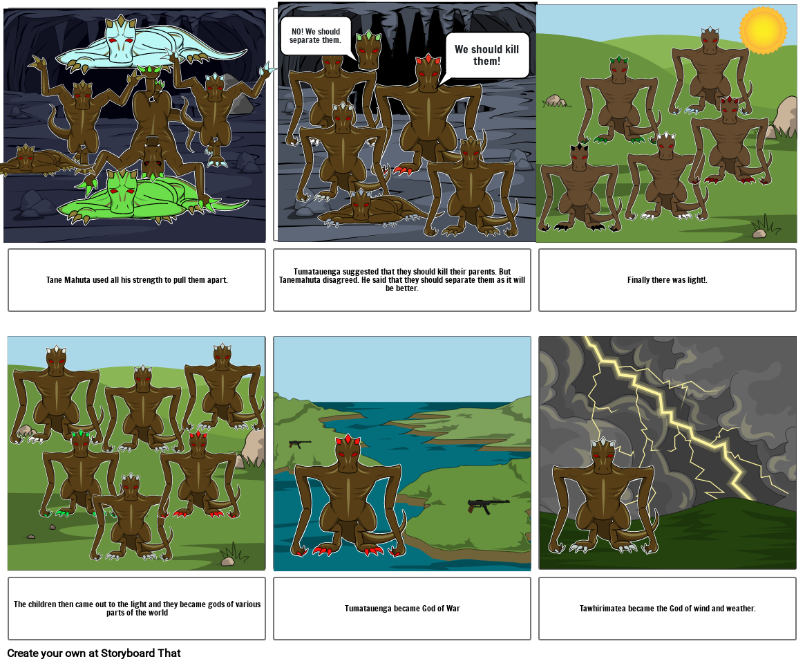 Tumatauenga suggested that they should kill their parents. But Tanemahuta disagreed. He said that they should separate them as it will be better.