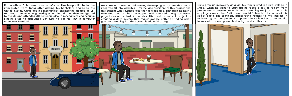 Guha grew up in poverty as a kid, his family lived in a rural village in India. When he went to Stanford he faced a lot of racism from pretentious professors. When he was searching for jobs some of his employers were also Indian and wouldn’t hire him because of his social caste. His technical background relates to my interest in technology and computers. Computer science is a field I am heavily interested in pursuing, and his background excites me.