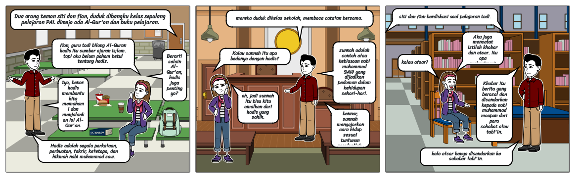 Dua orang teman siti dan fian, duduk dibangku kelas sepulang pelajaran PAI. dimeja ada Al-Qur'an dan buku pelajaran.