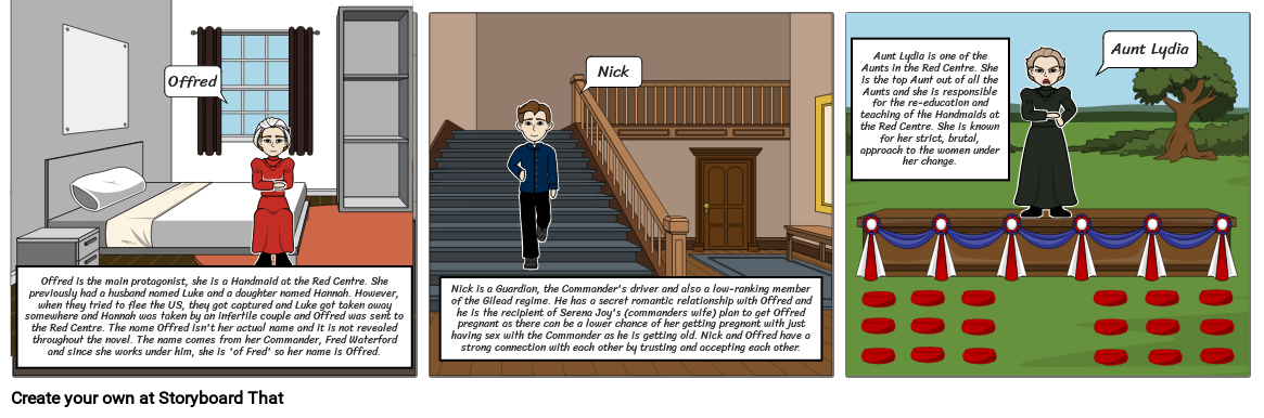 Offred is the main protagonist, she is a Handmaid at the Red Centre. She previously had a husband named Luke and a daughter named Hannah. However, when they tried to flee the US, they got captured and Luke got taken away somewhere and Hannah was taken by an infertile couple and Offred was sent to the Red Centre. The name Offred isn't her actual name and it is not revealed throughout the novel. The name comes from her Commander, Fred Waterford and since she works under him, she is 'of Fred' so her name is Offred.